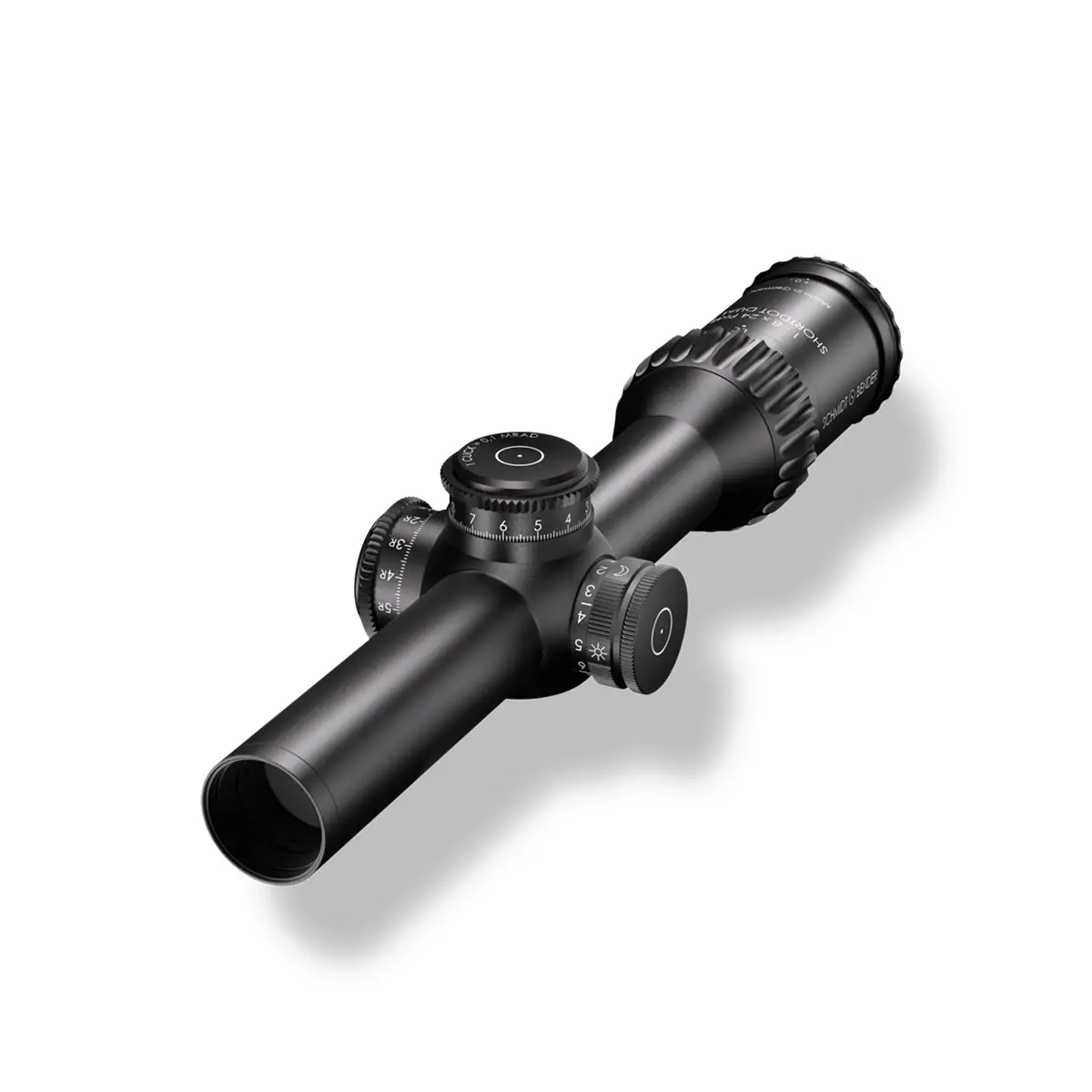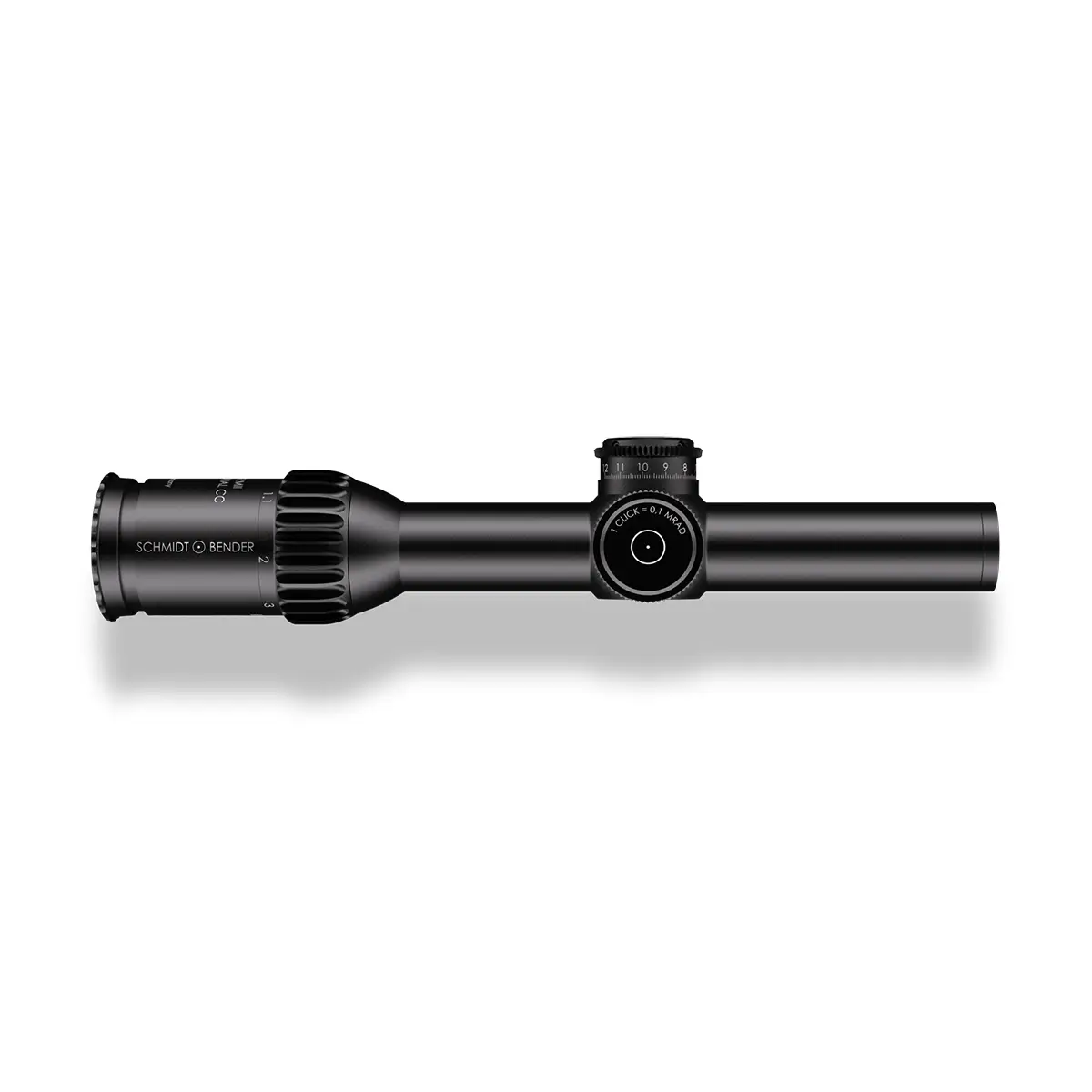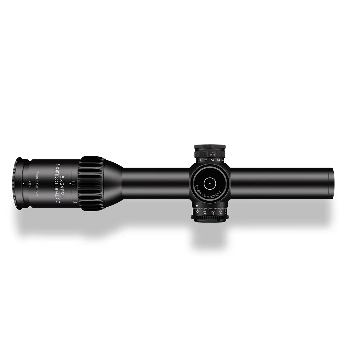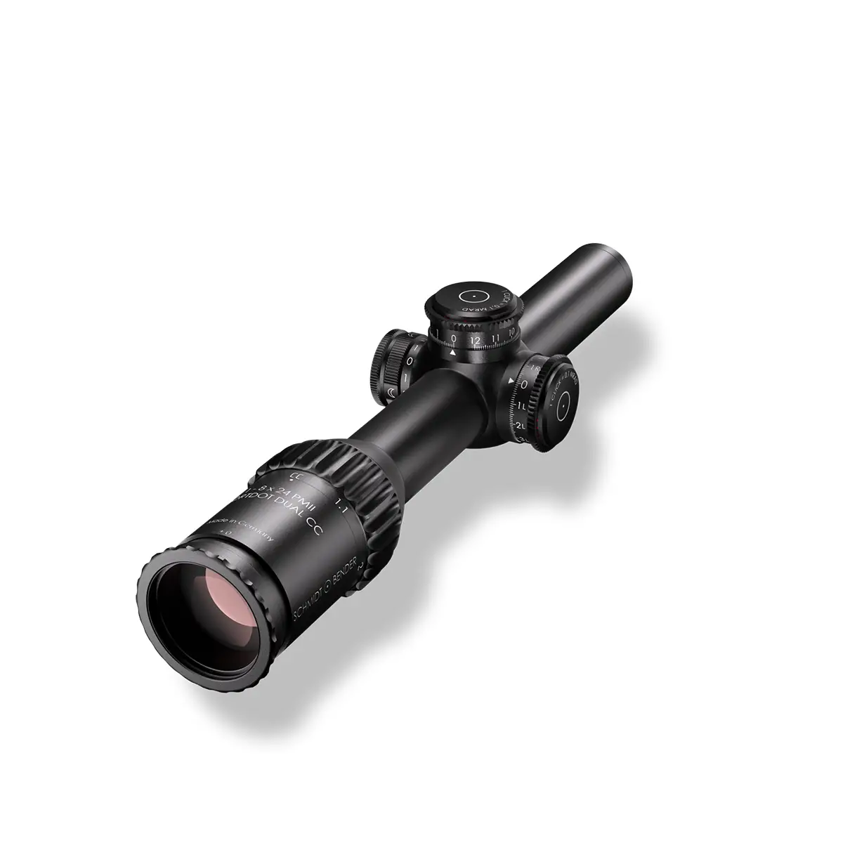 Das Schmidt & Bender 1-8×24 PM II ShortDot Dual CC vereint die Eigenschaften eines Rotpunktes und eines Zielfernrohres. Es ist auf kurze bis mittlere Distanzen und von Sturm- bis DMR-Gewehren sowohl dynamisch als auch statisch einsetzbar. Bereits 2016 überzeugte es durch den Gewinn der Bundeswehrausschreibung G28 Patrouille und auch 2019 wurden für das neue halbautomatische Scharfschützengewehr FPSA der französischen Streitkräfte über 2.700 Stück ausgeliefert. Seither ist das Schmidt & Bender 1-8×24 PM II ShortDot Dual CC bei weiteren NATO-Staaten, Spezialkräften des US-Militärs sowie Antiterroreinheiten im Einsatz. Das kompakte Schmidt & Bender 1-8×24 PM II ShortDot Dual CC ermöglicht eine schnelle und verlässliche Zielerfassung dank einer großen Austrittspupille. Der patentierte CC-Modus sorgt auf Nahdistanzen für einen parallaxenfreien Schuss. Außerhalb des Modus erlaubt es parallaxenfreies Schießen auf 100 m oder auf Kundenwunsch auch auf 300 m. Mit einer optischen Auflösung von acht Winkelsekunden bei 8-facher Vergrößerung reizt es die technischen Grenzen aus und bietet ein detailreiches und klares Bild. Seine robuste Bauweise hält extremen Belastungen wie dem „Six Orientation Drop Test“ oder auch Schocktests mit tausendfachen g-Kräften stand. Der Einsatz in Klimazone C2 (-46°C) ist problemlos möglich. Zur Schusskorrektur können das taktische Absehen in der ersten Bildebene oder die arretierbaren, ultraflachen Verstelltürme mit MTC- oder ZC-Funktion genutzt werden. Absehen MDR.